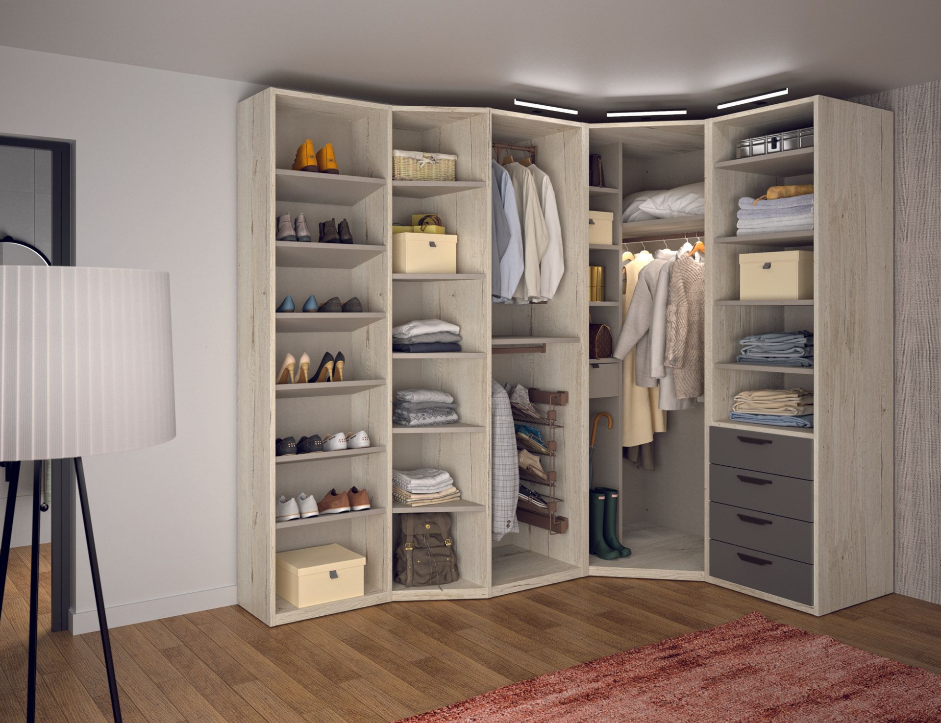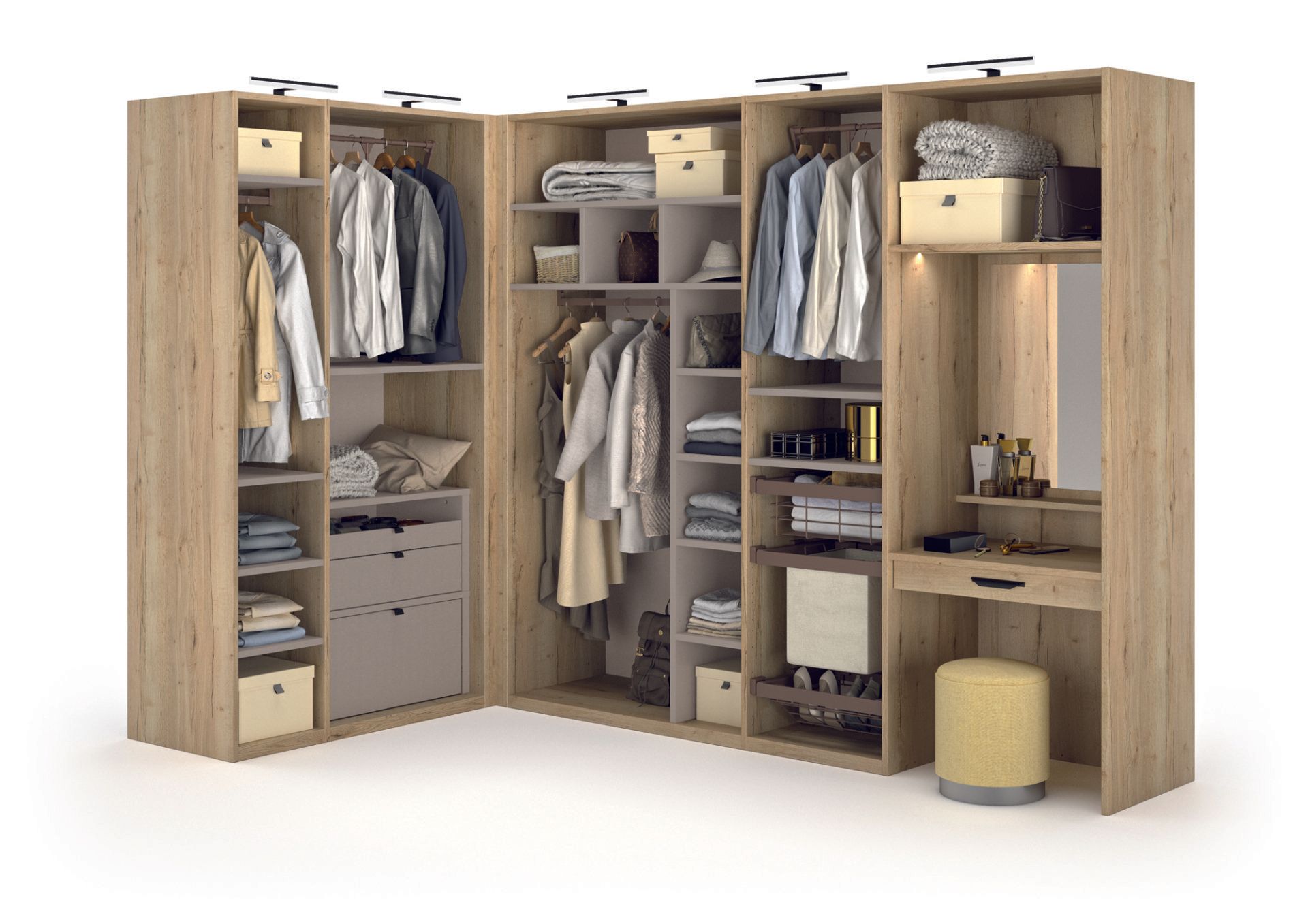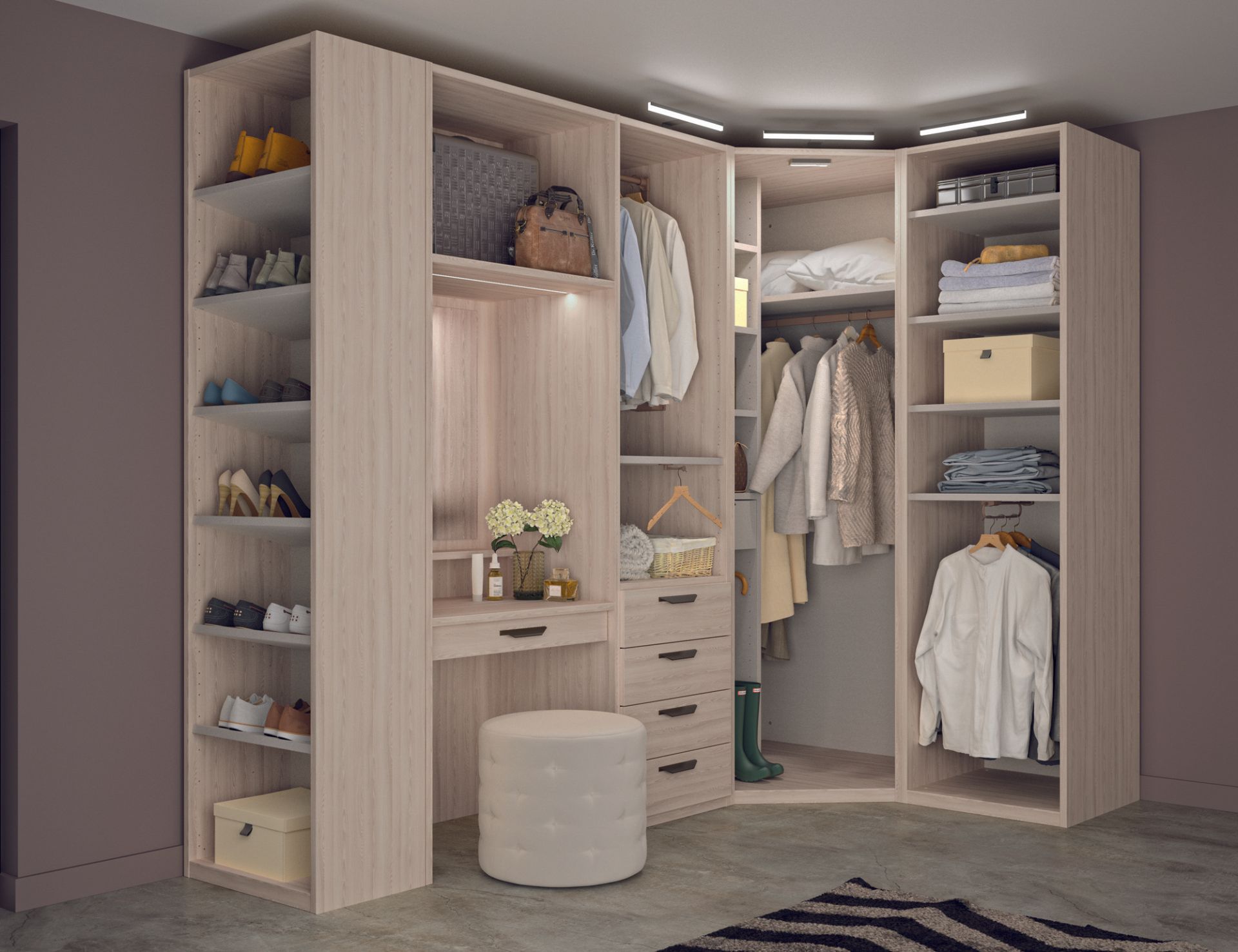 Portes battantes, tiroirs, module d'angle, meuble de liaison, meuble à chaussures, coiffeuse, bureau et divers accessoires, facilitant l'organisation et le rangement.